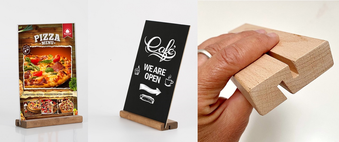 Houten kaarthouder recht en in hoek + A5 krijt- of acrylaatbordje - 150 mm lang